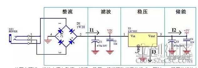 從圖上可知,線性電源適配器有整流、濾波、穩(wěn)壓、儲能等功能元件組成,同時,一般用的線性電源適配器為串聯(lián)穩(wěn)壓電源,輸出電流等于輸入電流,I1=I2+I3,I3是參考端,電流很小,因此I1≈I3。我們?yōu)槭裁匆v電流,是因為電源適配器PCB設(shè)計時,每條線的寬度不是隨便設(shè)的,是要根據(jù)電源適配器原理圖里元件節(jié)點間的電流大小來確定的(請查《PCB設(shè)計銅鉑厚度、線寬和電流關(guān)系表》)。電流大小、電流流向要搞清楚,做板才恰到好處。