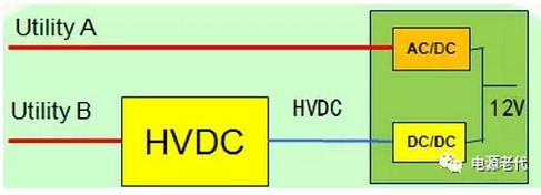 目前大的IDC機房已大量應用高壓直流電源適配器替代UPS,如下圖拓樸在BAT機房廣泛采用,負載供電采用雙電源適配器,一部分采用市電直供,較大限度的提高系統的效率,一部分采用高壓直流,較大限度的提高可靠性,這種拓樸結構如采用雙路交流電,就從理論上避免了主設備采用大容量ATS(目前還是采用的).