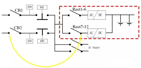 電源適配器送CB2上級交流電、維持CB2、Rect2空開斷開狀態:此時,不管ATS狀態,只要交流2有電,負載就一直正常;