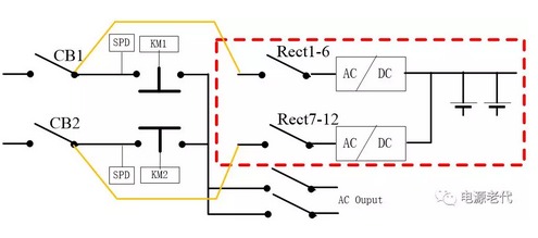 圖5.1為艾默生網絡能源有限公司PS48600-3/2900-X4系統示意圖,可看出:電源適配器輸入兩路交流市電經CC級ATS后到交流母線,交流有幾個支路帶交流負載,其余主要是給直流系統用(如紅色框中部分);