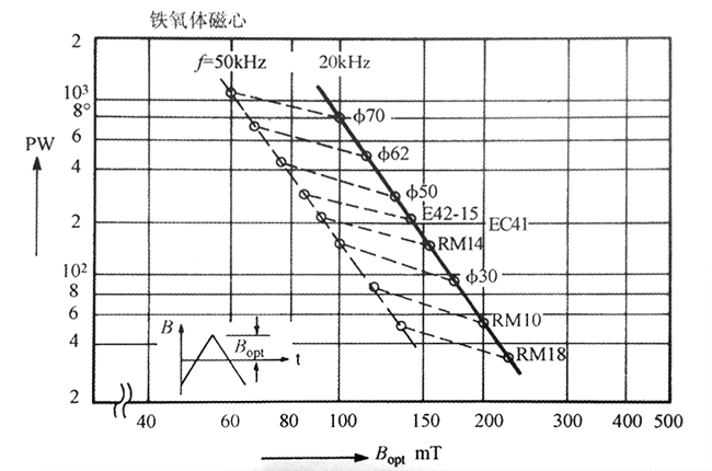 根據圖,對于100W、工作頻率為30kHz、工作于推挽狀態的情況,推薦的較佳峰值磁通偏移B=約為150mT。記住在推挽工作情況下,磁振幅差(△B)是該峰值的兩倍,所以磁密度峰峰值是300mT(見圖)。