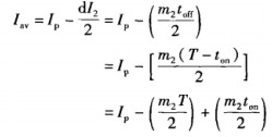 如圖所示,穩態下,導通時間內輸出電感上電流上升的值和關斷時間內電流下降的值是相等的。如果不相等,輸出電感兩端就會有直流電壓。因為已經假設電感的電阻可忽略,所以它是無法承受直流電壓的。從圖可見,直流輸入較低時的電感平均電流值要比輸入較高時的值大,這可定量地從下面等式的分析中得出。