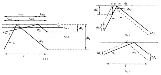 (a)不同輸入電壓下的輸出電感電流波形。在電流模式下,電感峰值電流是恒定的。直流輸入電壓較低時,較大,對應產生的電感平均電流為l;隨著直流輸入電壓的升高,導通時間會減小以維持輸出恒定。但是對應的電感平均電流L比L小。由于輸出電壓和電感電流的平均值(而非峰值)相關,輸入電壓變化時會引起振蕩。m2為電感電流的下降斜率,m1是低壓輸入時電感電流的上升斜率,m1是高壓輸入時電感電流的上升斜率。