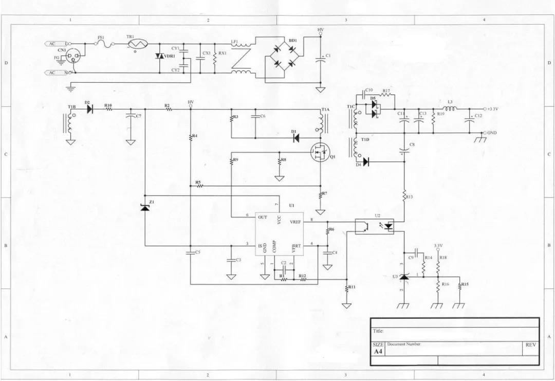 13)其它: 因為輸出為3.3V,而TL431的Vref值為2.5V,若再加上photo coupler上的壓降約1.2V,將使得輸出電壓無法推動Photo coupler及TL431,所以必須另外增加一組線圈提供回授路徑所需的電壓。