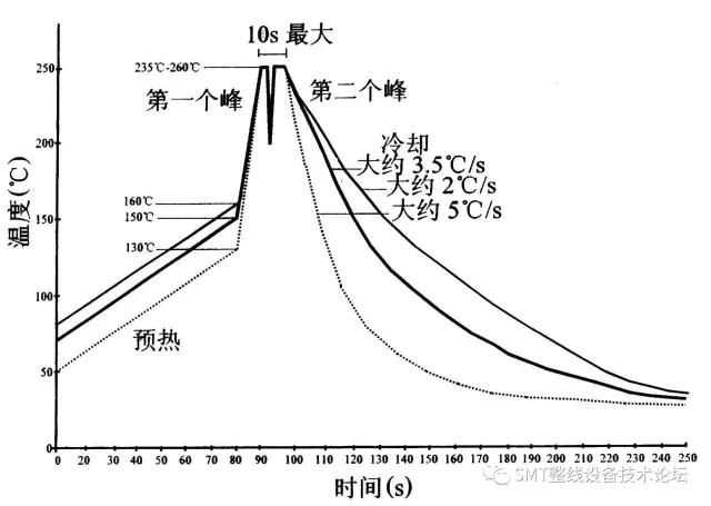 SMA類型 元器件 預(yù)熱溫度 單面板組件 通孔器件與混裝 90~100 雙面板組件 通孔器件 100~110 雙面板組件 混裝 100~110 多層板 通孔器件 115~125 多層板 混裝 115~125