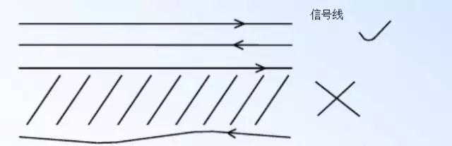 7、 用銅箔進行低感、低阻配線,相鄰之間不應有過長的平行線,走線盡量避免平行、交叉用垂直方式,線寬不要突變,走線不要突然拐角(即:≤直角)。(同一電流回路平行走線,可增強抗干擾能力)
