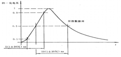 試驗發(fā)生器性能的主要指標有三個:單個脈沖波形、脈沖的重復頻率和輸出電壓峰值。 GB/T 17626.4 要求試驗發(fā)生器輸出波形應如圖 14, 15 所示。
