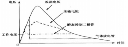 壓敏電阻、 瞬態抑制二極管和氣體放電管具有不同的伏安特性,因此浪涌通過它們時發生的變化不同,圖 20 對浪涌通過這三種器件時的變化進行了比較。