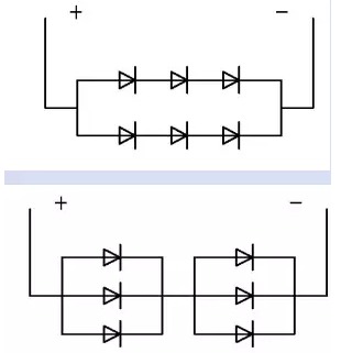 串并混聯(lián)方式 在需要使用比較多LED的產(chǎn)品中,如果將所有LED串聯(lián),將需要LED驅(qū)動(dòng)器輸出較高的電壓。如果將所有LED并聯(lián),則需要LED驅(qū)動(dòng)器輸出較大的電流。 將所有LED串聯(lián)或并聯(lián),不但限制著LED的使用量,而且并聯(lián)LED負(fù)載電流較大,驅(qū)動(dòng)器的成本也會(huì)大增。解決辦法是采用混聯(lián)方式。串并聯(lián)的LED數(shù)量平均分配,分配在一串LED上的電壓相同,通過(guò)同一串每顆LED上的電流也基本相同,LED亮度一致。同時(shí)通過(guò)每串LED的電流也相近。 當(dāng)某一串聯(lián)LED上有一顆品質(zhì)不良短路時(shí),不管采用恒壓式驅(qū)動(dòng)還是恒流式驅(qū)動(dòng),這串LED相當(dāng)于少了一顆LED,通過(guò)這串LED的電流將大增,很容易就會(huì) 損壞這串LED。大電流通過(guò)損壞的這串LED后,由于通過(guò)的電流較大,多表現(xiàn)為斷路。斷開(kāi)一串LED后,如果采用恒壓式驅(qū)動(dòng),驅(qū)動(dòng)器輸出電流將減小,而不 影響余下所有LED正常工作。如果是采用恒流式LED驅(qū)動(dòng),由于驅(qū)動(dòng)器輸出電流保持不變,分配在余下LED電流將增大,導(dǎo)致容易損壞所有LED。解決辦法是盡量多并聯(lián)LED,當(dāng)斷開(kāi)某一顆LED時(shí),分配在余下LED電流不大,不至于影響余下LED正常工作。 混聯(lián)方式還有另一種接法,即是將LED平均分配后,分組并聯(lián),再將每組串聯(lián)一起。 當(dāng)有一顆LED品質(zhì)不良短路時(shí),不管采用恒壓式驅(qū)動(dòng)還是恒流式驅(qū)動(dòng),并聯(lián)在這一路的LED將全部不亮,如果是采用恒流式LED驅(qū)動(dòng),由于驅(qū)動(dòng)器輸出電流保持不變,除了并聯(lián)在短路LED的這一并聯(lián)支路外,其余的LED正常工作。假設(shè)并聯(lián)的LED數(shù)量較多,驅(qū)動(dòng)器的驅(qū)動(dòng)電流較大,通過(guò)這顆短路的LED電流將增大,大電流通過(guò)這顆短路的LED后,很容易就變成斷路。由于并聯(lián)的LED較多,斷開(kāi)一顆LED的這一并聯(lián)支路,平均分配電流不大,依然可以正常工作,哪么 整個(gè)LED燈,僅有一顆LED不亮。 如果采用恒壓式驅(qū)動(dòng),LED品質(zhì)不良短路瞬間,負(fù)載相當(dāng)少并聯(lián)一路LED,加在其余LED上的電壓增高,驅(qū)動(dòng)器輸出電流將大增,極有可能立刻損壞所有 LED,幸運(yùn)的話,只將這顆短路的LED燒成斷路,驅(qū)動(dòng)器輸出電流將恢復(fù)正常,由于并聯(lián)的LED較多,斷開(kāi)一顆LED的這一并聯(lián)支路,平均分配電流不大, 依然可以正常工作,哪么整個(gè)LED燈,也僅有一顆LED不亮. 通過(guò)對(duì)以上分析可知,驅(qū)動(dòng)器與負(fù)載LED串并聯(lián)方式搭配選擇是非常重要的,恒流式驅(qū)動(dòng)功率型LED是不適合采用并聯(lián)負(fù)載的,同樣的,恒壓式LED驅(qū)動(dòng)器不適合選用串聯(lián)負(fù)載。