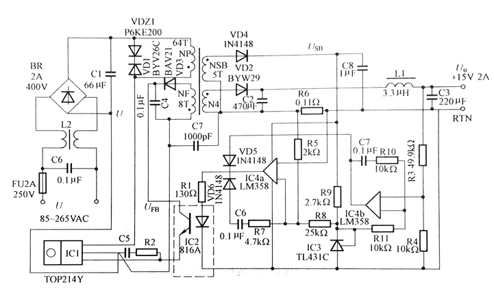IC4a的同相輸入端接電流檢測信號UR6,反相輸入端接分壓器電壓Ufy?分壓器是由R5?R8和TL431C構(gòu)成的?IC4a在將UB6與UFy進(jìn)行比較之后,輸出誤差。信號U,再通過VD5和R1變成電流信號,流入光耦中的LED,進(jìn)而控制TOP214Y的占空比,使電源的輸出電流Io在恒流區(qū)內(nèi)維持恒定?顯然,VD5和VD6就相當(dāng)于一個“或門”?
