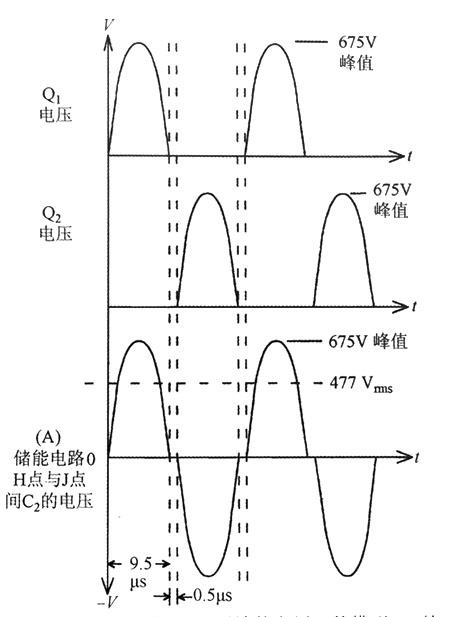 Q2導通時集電極電壓接近0V,215V的電源適配器和L迫使電流持續流入T:的中心抽頭(G點),諧振時所有繞組的起始端電壓均為圖1。23。9a所示的正弦半波。在半個周期結束時所有繞組的電壓均為0并且開始反向,使S末端的電壓變正而始端電壓變負。L1中已經建立的向上流動的電流此時流經D、Q1的基射極和D1返回L:的下端。這一電流連同來自于R1和S1末端的電流使Q2關斷。由于D4導通,S1始端的負電壓使Q2關斷。像前面一樣,S1的電壓使Q1進一步導通。Q1完全導通且Q2完全關斷,電路進入第2個半周期,原邊P1末端J點的電壓為正弦半波。兩個原邊繞組的電壓(以及C的電壓)如圖所示。