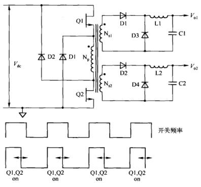 | 基本原理 電源適配器雙端正激變換器拓?fù)淙鐖D所示的單管單端(以下簡(jiǎn)稱單端)正激變換器使用單個(gè)開關(guān)管不同,雙端正激變換器使用兩個(gè)開關(guān)管,且這樣有顯著的優(yōu)點(diǎn)。即關(guān)斷時(shí),每個(gè)開關(guān)管僅承受一倍直流輸入電壓(單端正激變換器中為兩倍直流輸入電壓)。另外,關(guān)斷時(shí)也不出現(xiàn)漏感尖峰。 曾指出,考慮到15%的瞬態(tài)誤差、0%的穩(wěn)態(tài)誤差和30%的漏感尖峰,交流輸入為額定電壓120V的單端正激變換器的關(guān)斷電壓應(yīng)力高達(dá)550V。 盡管許多雙極型晶體管額定V。高達(dá)650V甚至850V,能夠承受這樣的電壓應(yīng)力,但使用只承受一半關(guān)斷電壓應(yīng)力的雙端正激變換器要更可靠。可靠性是開關(guān)電源適配器設(shè)計(jì)中重要的考慮因素。若權(quán)衡可靠性與原始成本,則較好的、從長(zhǎng)遠(yuǎn)看也是較經(jīng)濟(jì)的選擇是可靠性。 而且,對(duì)于用于歐洲市場(chǎng)的電源適配器(那里交流電壓為220V,整流后額定直流電壓約為308V),根本不能使用單端正激變換器,因?yàn)殚_關(guān)管關(guān)斷時(shí)電壓應(yīng)力太大。用于歐洲市場(chǎng)的產(chǎn)品,只能采用雙端正激變換器、半橋或全橋電路。 下面來樣定做電源適配器雙端正激變換器的工作原理。如圖所示,Q1和Q2分別串接于變壓器初級(jí)的頂端和底端。兩個(gè)開關(guān)管同時(shí)導(dǎo)通和關(guān)斷。當(dāng)它們導(dǎo)通時(shí),所有初級(jí)和次級(jí)的同名端為正功率傳遞給負(fù)載。當(dāng)它們關(guān)斷時(shí),存儲(chǔ)于們勵(lì)磁電感上的電流使所有繞組電壓極性反向。Np的同名端電位被二極管D1鉗位至地電位。N的異名端電位被二極管D2鉗位于Vdc。