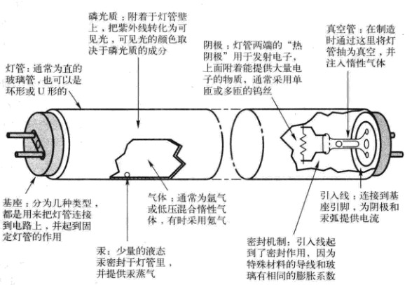 燈管上可以涂各種磷光質,這些磷光質會被大電流的汞弧產生的紫外線激發,從面產生需要的可見光。當高壓施加于燈管兩端的電極時,就會在燈管里流過較大的電流。