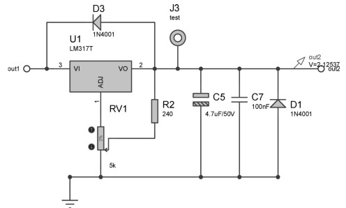 ![]() 為了驗(yàn)證濾波電容的效果,在原電路輸入基礎(chǔ)上將濾波電容C1改為100μF,輸入信號(hào)依然為15V、50Hz的交流信號(hào),設(shè)置方法如圖所示。利用軟件圖表功能仿真out1端輸出波形,如圖所示。 ![]() 如圖所示,濾波電路中電容大小直接影響電路的濾波效果。若將電容值設(shè)置過(guò)小,電路的濾波效果也會(huì)減弱。 綜上所述,輸入的交流信號(hào)經(jīng)整流電路整流,又經(jīng)濾波電路,后面將穩(wěn)定有效的電壓由out1端傳輸至穩(wěn)壓電路模塊??梢?jiàn),濾波電路在電路設(shè)計(jì)中是十分重要的。 3.穩(wěn)壓電路 使用三端穩(wěn)壓器有以下優(yōu)點(diǎn)。 (1)元件數(shù)量少。 (2)帶有限流電路,輸出短路時(shí)不會(huì)損壞元件。 (3)帶有熱擊穿功能。 三端穩(wěn)壓器選擇LM317(輸出電流為1.5A,輸出電壓可在1.25~37V之間連續(xù)調(diào)節(jié)),其輸出電壓由兩只外接電阻R2、RV1決定,輸出端和調(diào)整端之間的電壓差為1.25V。在輸出端同時(shí)并入二極管D1(型號(hào)為1N4001),當(dāng)三端穩(wěn)壓器未接入輸入電壓時(shí)可保護(hù)其不至于損壞。 閉路電視電源適配器信號(hào)由out1端輸入至三端穩(wěn)壓器,利用RV1控制輸出電壓大小,調(diào)節(jié)RV1電位器至位置1(2%)處,此時(shí)輸出電壓為2.12V,負(fù)載LED不點(diǎn)亮,電路仿真結(jié)果如圖2-10所示。 ![]() 三端穩(wěn)壓器較易損壞的是輸出腳(圖中2腳)電壓高于輸入腳(圖中3腳)而形成擊穿,因此一般像圖2-10中那樣并聯(lián)一個(gè)二極管1N4001,它的主要作用是:如果輸入端C1或C2出現(xiàn)短路,則輸出2腳會(huì)高于輸入3腳,很容易擊穿穩(wěn)壓器,所以反向并聯(lián)一個(gè)二極管,對(duì)1腳電壓進(jìn)行泄放,使2腳到3腳電壓限幅為0.7V,可有效保護(hù)穩(wěn)壓器不被反向擊穿。 用示波器監(jiān)視RV1處于位置1時(shí)穩(wěn)壓電路空載輸出端out2,結(jié)果如圖所示。 ![]() 調(diào)節(jié)RV1,使其到達(dá)位置2(16%),則穩(wěn)壓電路輸出端out2電壓也會(huì)增大。此時(shí)輸出電壓為6.37V,負(fù)載LED被點(diǎn)亮,如圖所示。 圖 RV1處于位置2時(shí)穩(wěn)壓電路仿真圖 用示波器監(jiān)視高擋位穩(wěn)壓電路輸出,結(jié)果如圖所示。 ![]() 在穩(wěn)壓輸出端out2處接入2kΩ電阻與LED負(fù)載進(jìn)行穩(wěn)壓測(cè)試,如圖所示。 加入2kΩ電阻與LED負(fù)載后,由穩(wěn)壓器輸出的直流電壓大小為6.37V,并可將LED點(diǎn)亮。用示波器監(jiān)視穩(wěn)壓電路輸出,結(jié)果如圖所示。 圖RV1處于位置2時(shí)穩(wěn)壓電路輸出仿真圖圖 穩(wěn)壓電路負(fù)載輸出仿真圖(一) 隨后在穩(wěn)壓器輸出端out2處加入5kΩ電阻與LED負(fù)載進(jìn)行測(cè)試,如圖所示。 圖穩(wěn)壓電路負(fù)載輸出仿真圖(二) 加入5kΩ電阻與LED負(fù)載后,由穩(wěn)壓器輸出的直流電壓大小為6.37V,并可將LED點(diǎn)亮。用示波器監(jiān)視穩(wěn)壓電路當(dāng)前輸出,結(jié)果如圖所示。 綜上所述,本項(xiàng)目所設(shè)計(jì)的可調(diào)式直流穩(wěn)壓電源適配器,能夠在負(fù)載變化的情況下提供穩(wěn)定可調(diào)的直流穩(wěn)壓電源適配器。 可調(diào)式單電源適配器直流穩(wěn)壓電路的整體電路原理圖如圖所示。 圖整體電路原理圖 經(jīng)過(guò)對(duì)電路板進(jìn)行實(shí)際測(cè)試,輸入15V交流電壓,輸出可以在1.48~14.84V之間可調(diào),基本符合設(shè)計(jì)要求。PCB版圖(見(jiàn)圖) 實(shí)物測(cè)試(見(jiàn)圖) 可調(diào)式單電源適配器直流穩(wěn)壓電路實(shí)物圖 為了提高電子設(shè)備的精度及穩(wěn)定性,在直流電源適配器中還要加入穩(wěn)壓電路,因此稱(chēng)為直流穩(wěn)壓電源適配器。典型的直流穩(wěn)壓電源適配器主要由電源適配器變壓器、整流電路、濾波電路和穩(wěn)壓電路等幾部分構(gòu)成。電源適配器變壓器把50Hz的交流電網(wǎng)電壓變成所需要的交流電壓;整流電路用來(lái)將交流電變換為單向脈動(dòng)直流電;濾波電路用來(lái)濾除整流后單向脈動(dòng)電流中的交流成分(即紋波電壓),使其成為平滑的直流電;穩(wěn)壓電路的作用是當(dāng)輸入交流電網(wǎng)電壓波動(dòng)、負(fù)載及溫度變化時(shí),維持輸出直流電壓的穩(wěn)定。本項(xiàng)目所介紹的可調(diào)式單電源適配器直流穩(wěn)壓電路在固定式單電源適配器直流穩(wěn)壓電路的基礎(chǔ)上,具有電壓可控、電壓穩(wěn)定度高等特點(diǎn),其輸出電壓精確可測(cè),可用于電源適配器精度要求比較高的設(shè)備或科研實(shí)驗(yàn)。