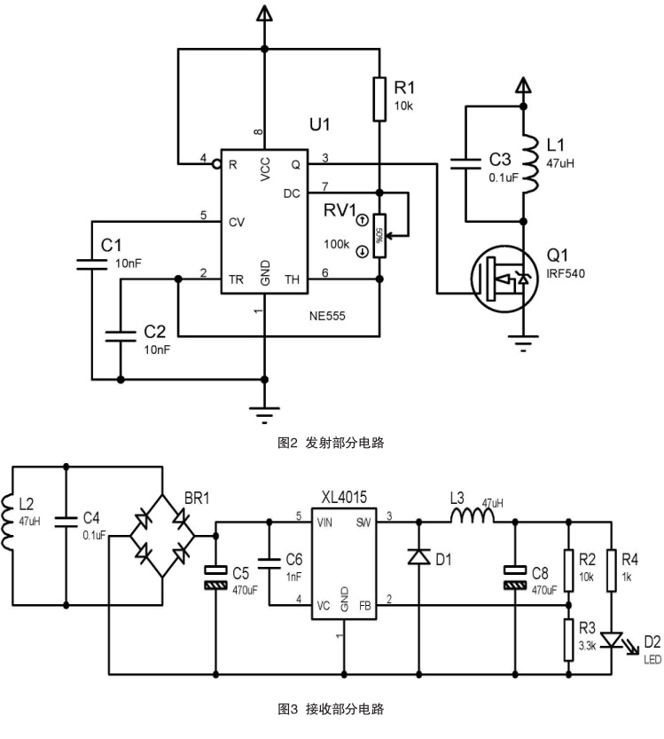 為了促使LC發送電路與LC接收電路諧振頻率一致,發送和接收選用一致的電路,本系統選用電感L與電容C并聯的方式連接。結合各方面考慮,電感L電感量選擇47μH,電容C容量選擇0.1μF。發送和接收電容兩端電壓較高,電容選擇630V/104CBB電容。