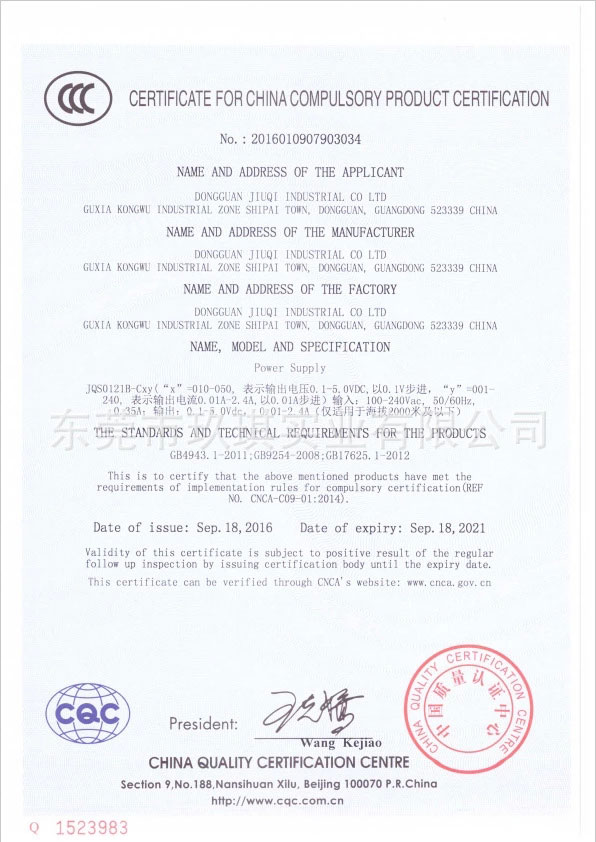 網站首頁 » 產品展示 » 產品認證 » 12W證書 » CCC安規證書-12W系列電源適配器