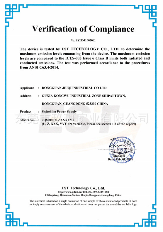 ICES-003安規證書-15W系列電源適配器